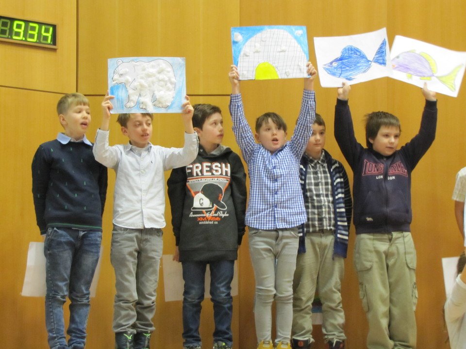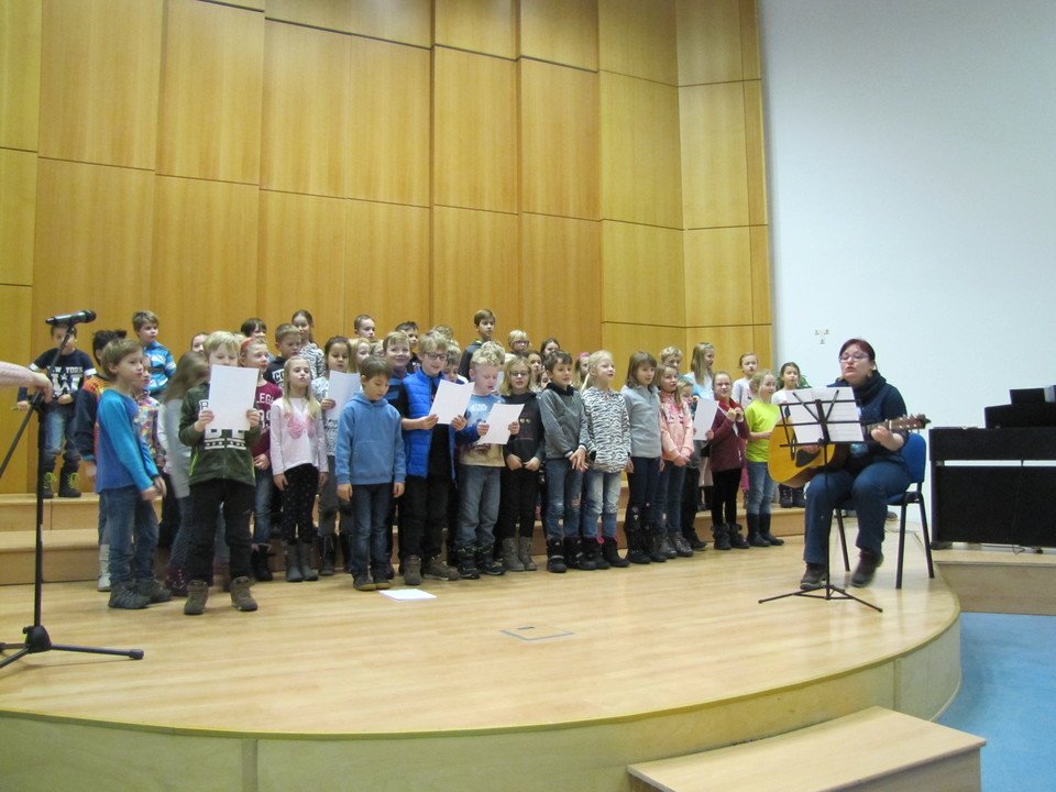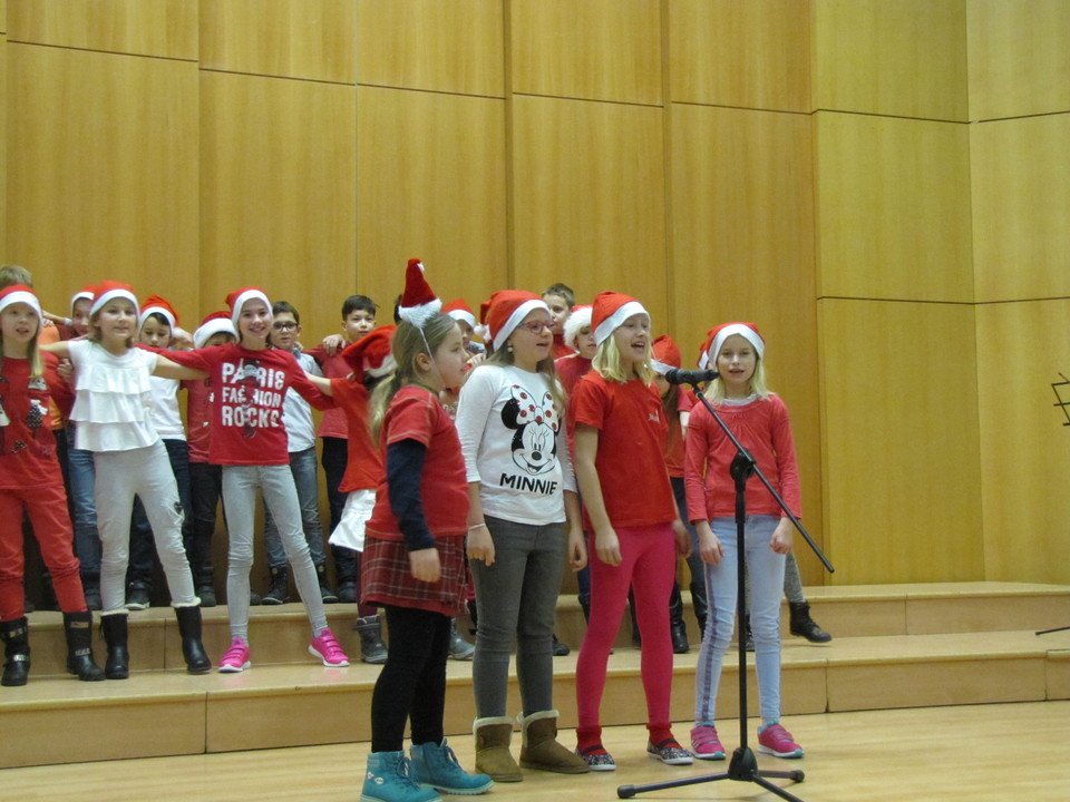 V čase předvánočním se schází všichni žáci a učitelé 1. stupně školy na tradiční představení Děti dětem.