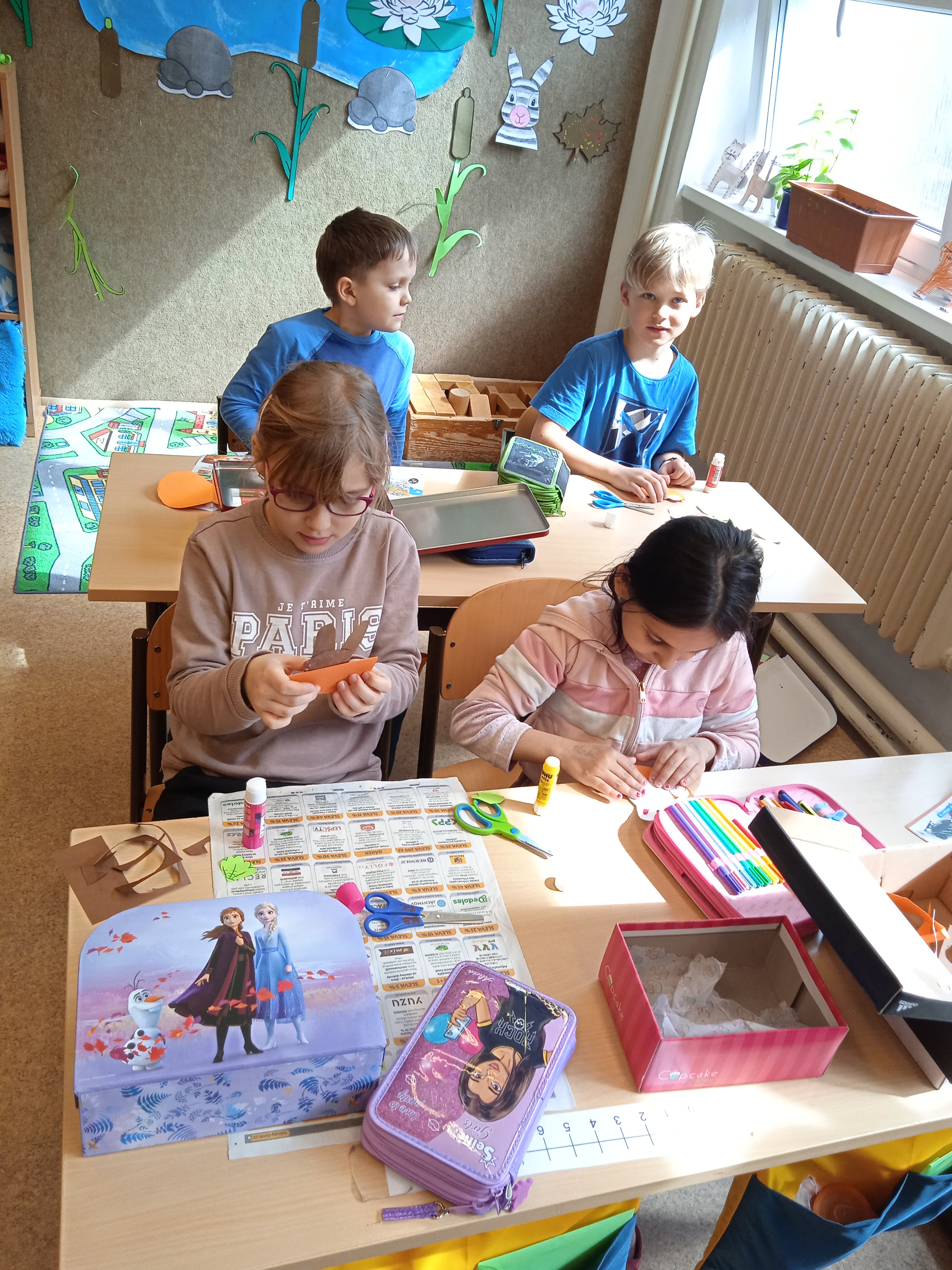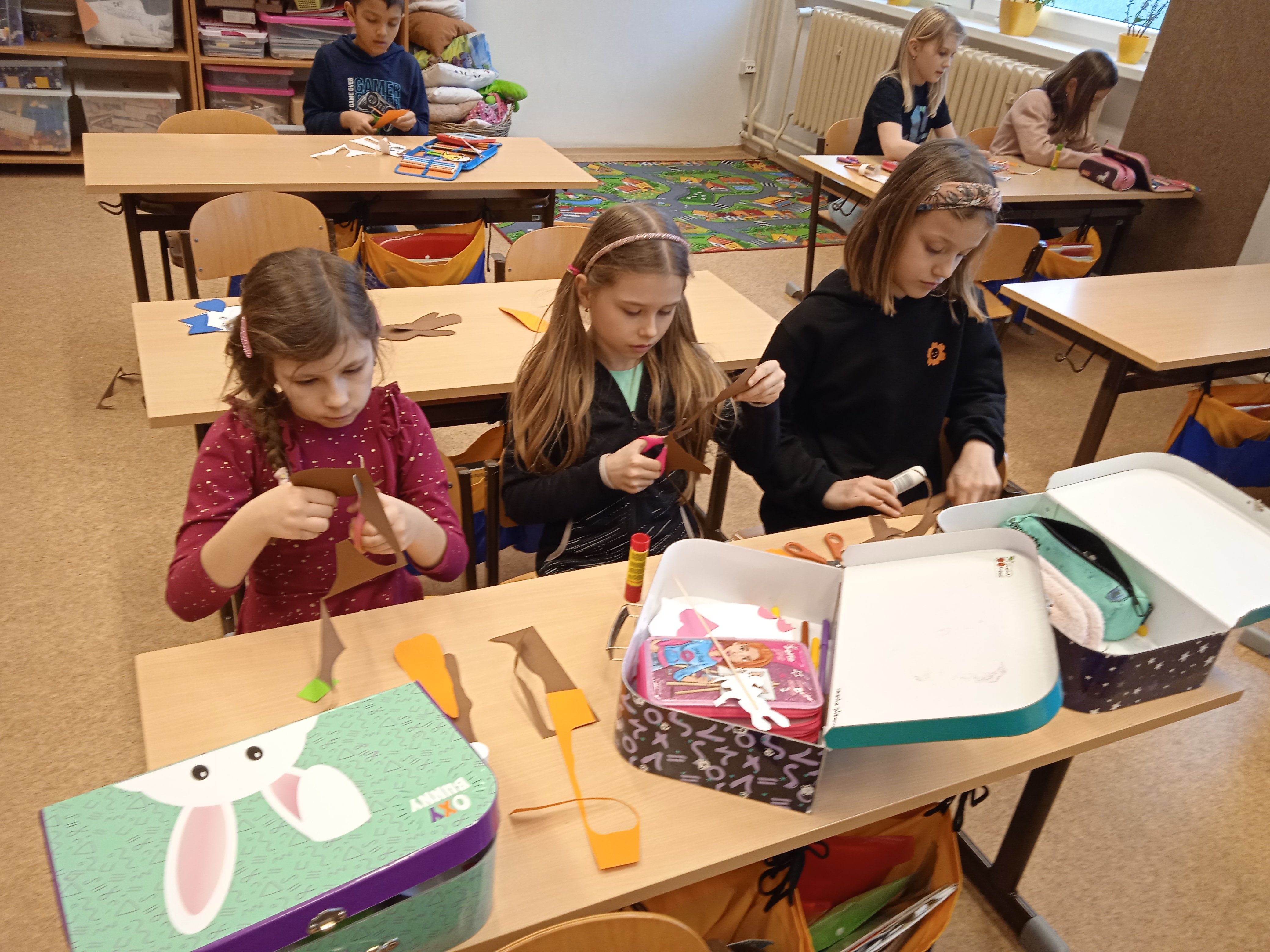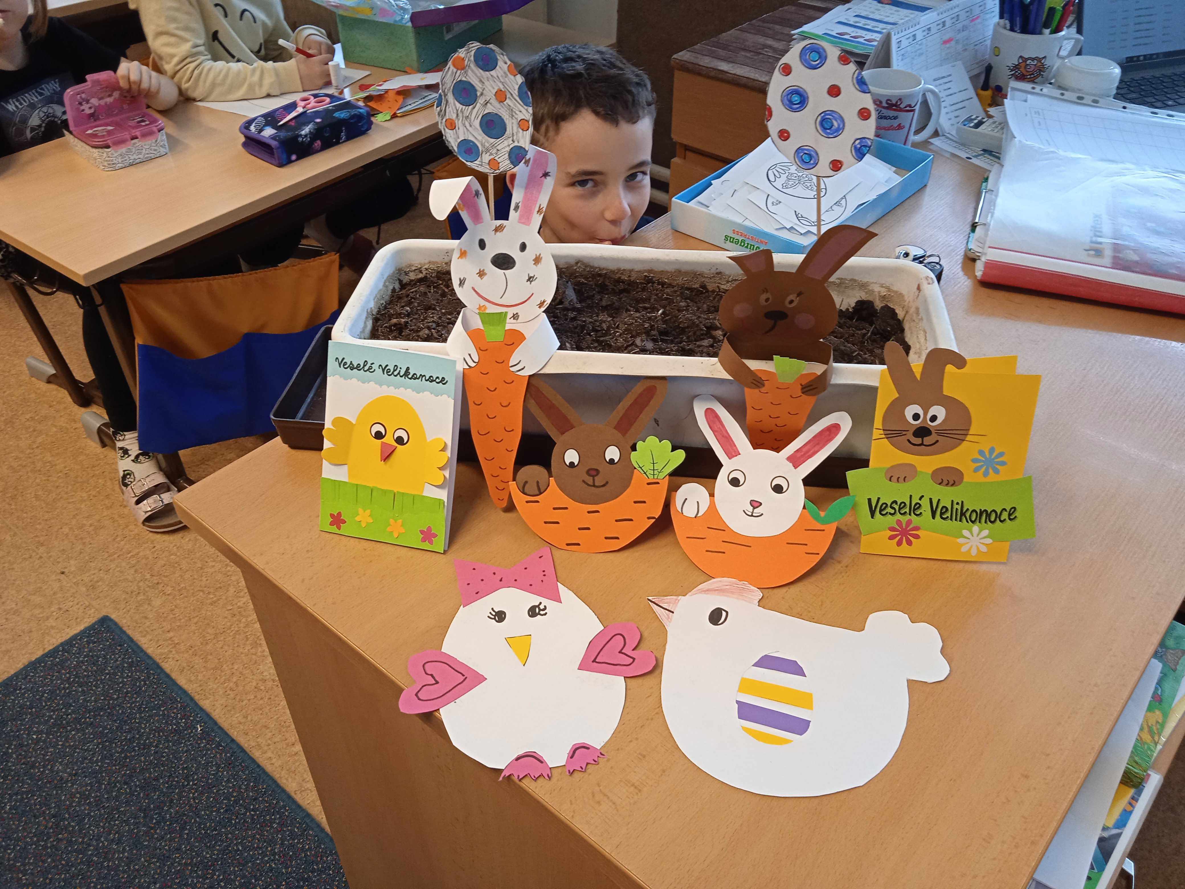 Poslední březnový den jsme za aprílového počasí vyrazili do tříd a vrhli jsme se do tvoření na tradiční velikonoční dílně. Paní vychovatelky si pro děti připravily na vyrábění velikonoční dekoraci jako velikonoční zajíčci, slepičky, králíčci nebo přáníčka.